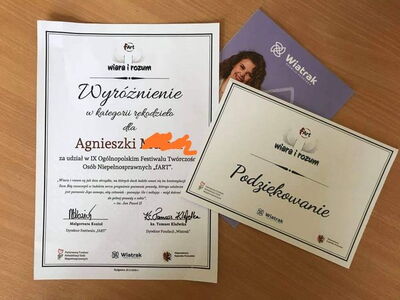 W dniu 14.01. dostaliśmy fantastyczną informację o sukcesie naszej uczestniczki Agnieszki w konkursie plastycznym zorganizowanym przez fundację „Wiatrak”. Jest to IX Ogólnopolski Festiwal Twórczości Osób Niepełnosprawnych „fART”. Agnieszka wykonała pracę techniką kolażu, za którą otrzymała wyróżnienie w kategorii rękodzieło. Serdecznie gratulujemy oraz życzymy dalszych sukcesów. Dziękujemy Fundacji „Wiatrak” za zaproszenie do konkurs